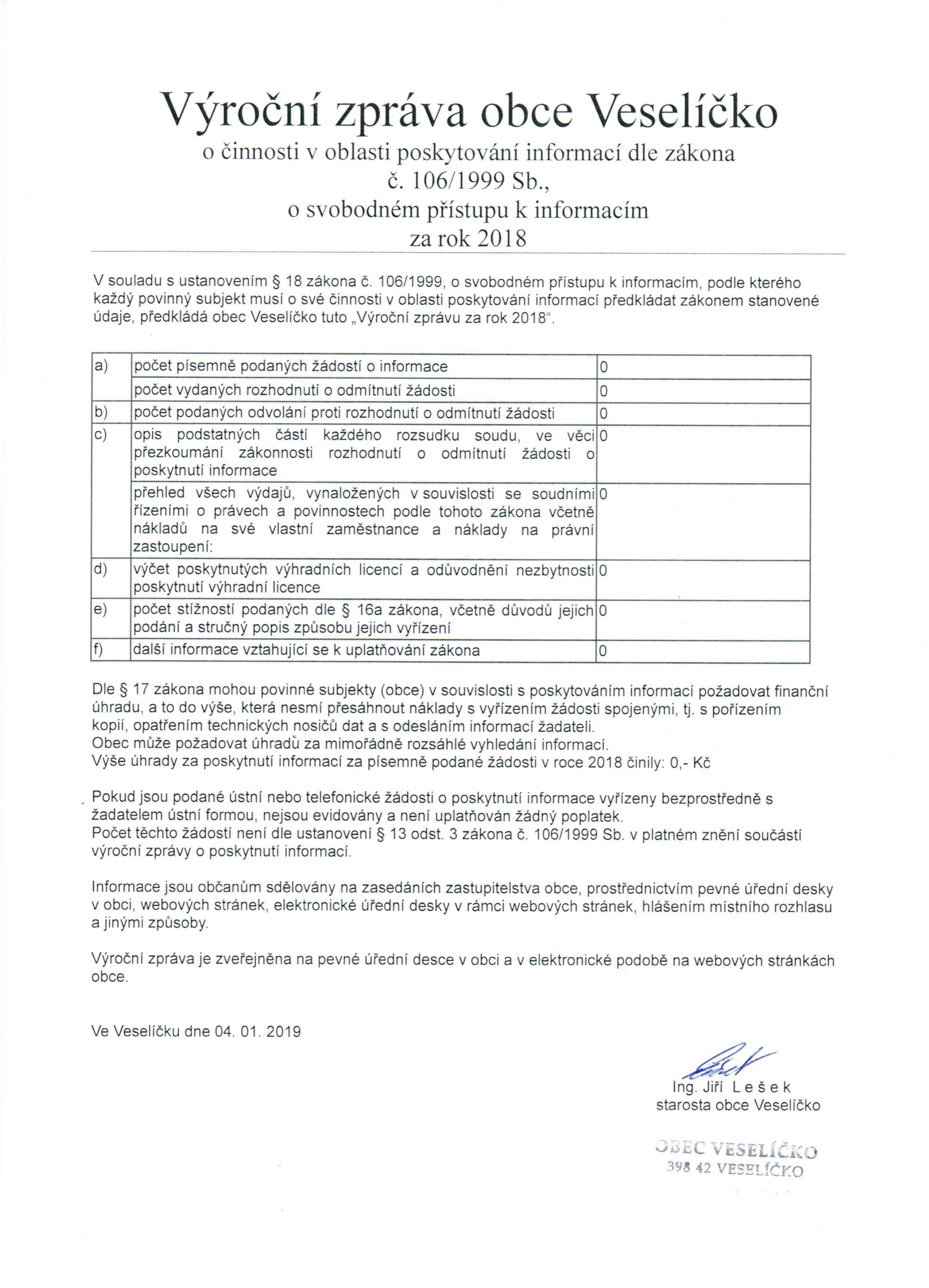 Výroční zpráva obce Veselíčko o činnosti v oblasti poskytování informací - r. 2018